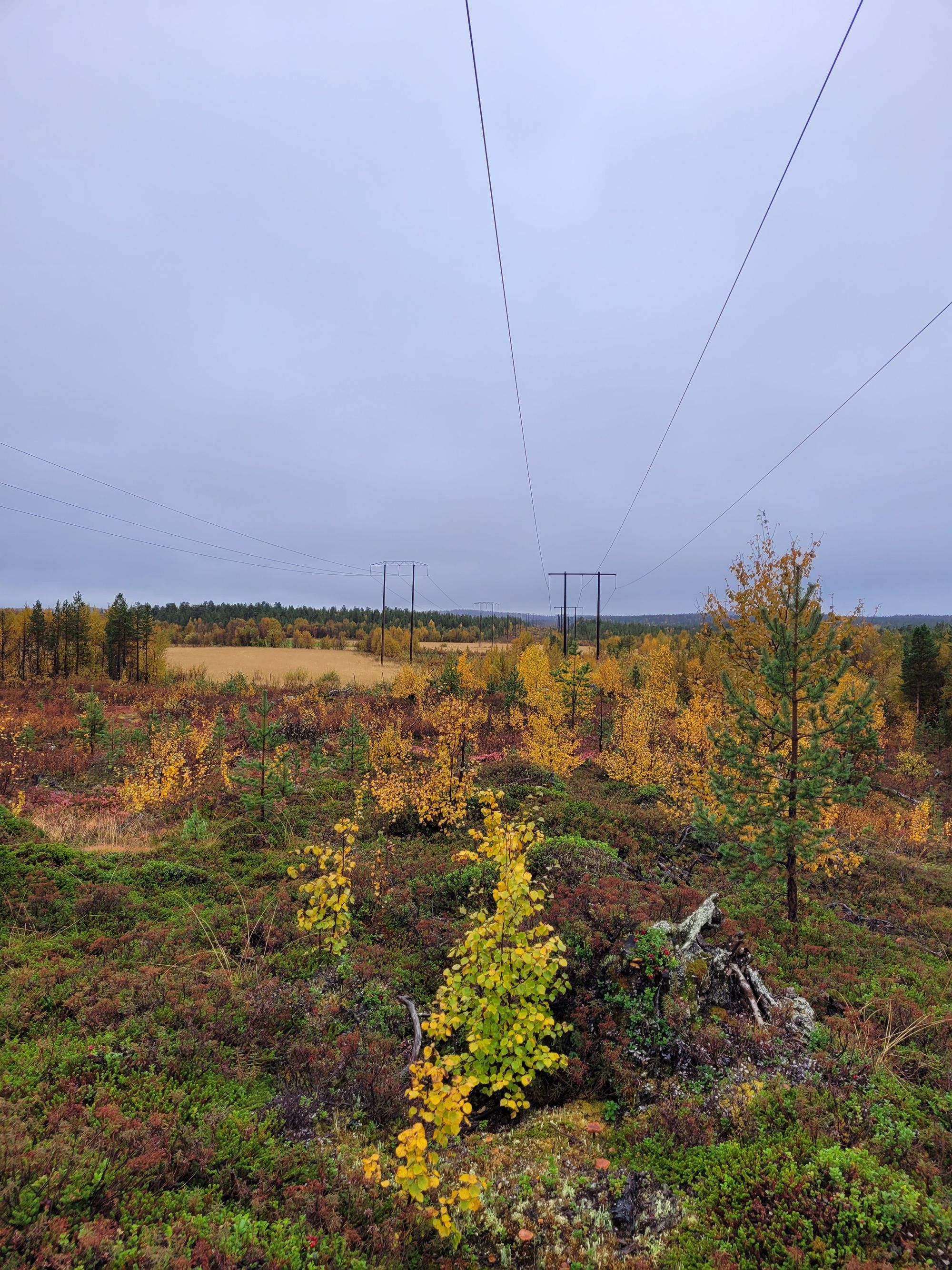 Mens jeg huket meg ned mellom tuene i den slake åsen der rakk jeg å filosofere en hel del. Mange ser på høyspentledninger som noe stygt, men jeg synes de kan være flotte. Og for folk her i dalen er de jo selve navlestrengen - livlinja. De synes godt i naturen, men er også tegn på fremgang og velstand. De gangene jeg har vært på vestlandet har jeg ofte syntes de digre høyspentledningene som stuper ned fra bratte fjell og over fjorder er fantastiske. Man får nesten sug i magen bare av å se på dem. De er en del av kulturlandskapet vårt, like viktig som fjøs og hekk.