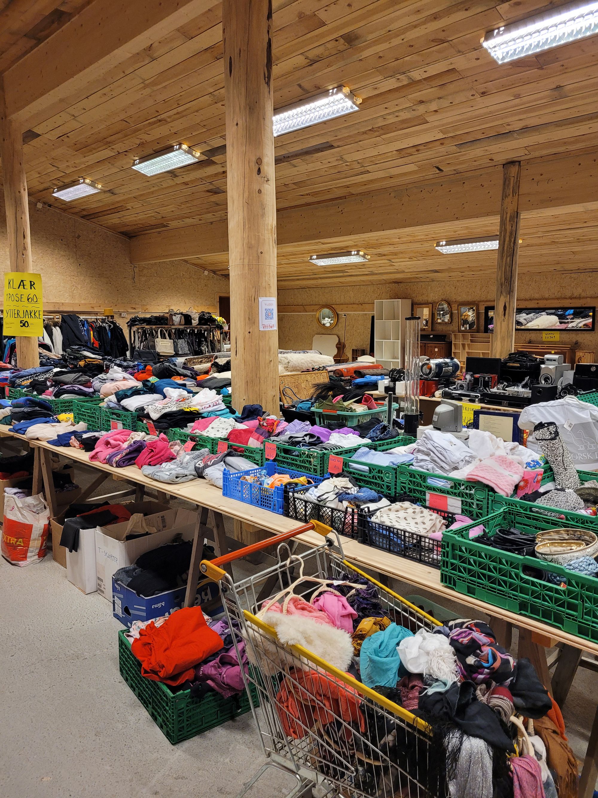Klessalget foregår posevis. Stapp det du klarer i en pose og betal 60 kroner. Jeg går jo på Fretex en gang i uka og der er det ganske dyrt. Dette her? Røverkjøp. Det er så billig at det lønner seg for meg å ta sekken ut av kofferten og betale 20 euro for å sjekke den inn. Jeg satser på å gjøre noen funn i morgen også, og da skal jeg fortelle om mine nye skatter. Og bruksplagg. En salig blanding.