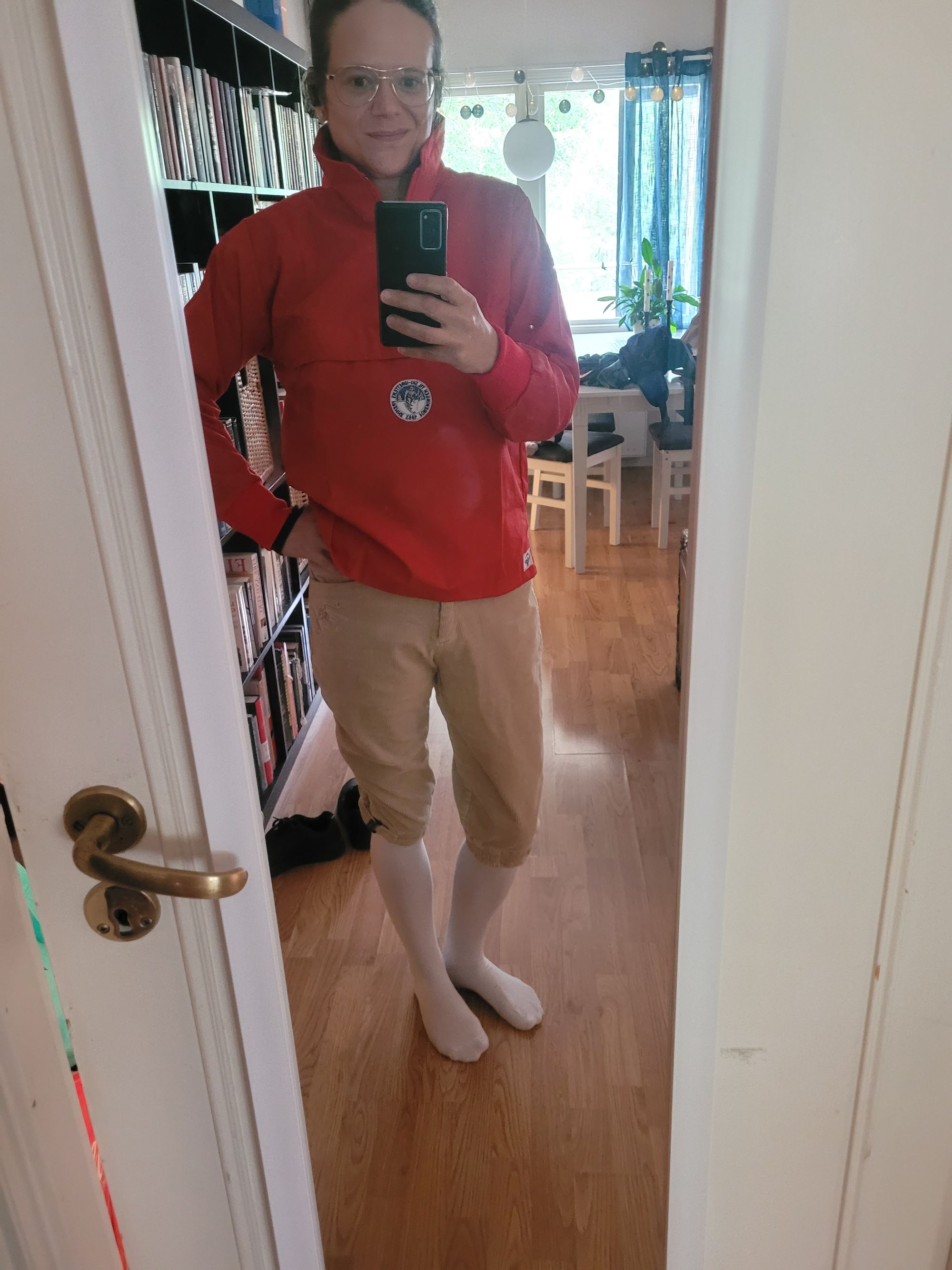 For noen uker siden fant jeg en anorakk av merket Ramah, som egentlig bare er Hamar baklengs. Jeg tror den er fra søttitallet, og den er helt ubrukt. Den er rød med cordfløyel i kragen, og foran er det et merke der det står "Foreningen til ski-idrettens fremme 1883". Den passet perfekt. Seinere samme uke fant jeg en knickers i beige bomullscord av merket Ljungberg Norwegian Design - skulle jeg gjette er denne også er fra søttitallet. Den passet perfekt, og den er også ubrukt, eller i allefall nesten ubrukt. Jeg ANER ikke når jeg skal få brukt dette gullantrekket, ikke går jeg på ski - og klærne er for fine til å bruke ved bålet. Men jeg har allerede begynt å planlegge å strikke knickersstrømper, retroskigenser og lue og votter i retrodesign. Kanskje jeg må finne noen beksømstøvler, hva nå enn det er. Sånne har jeg bare lest om i Anne-Cath. Vestlys bøker.